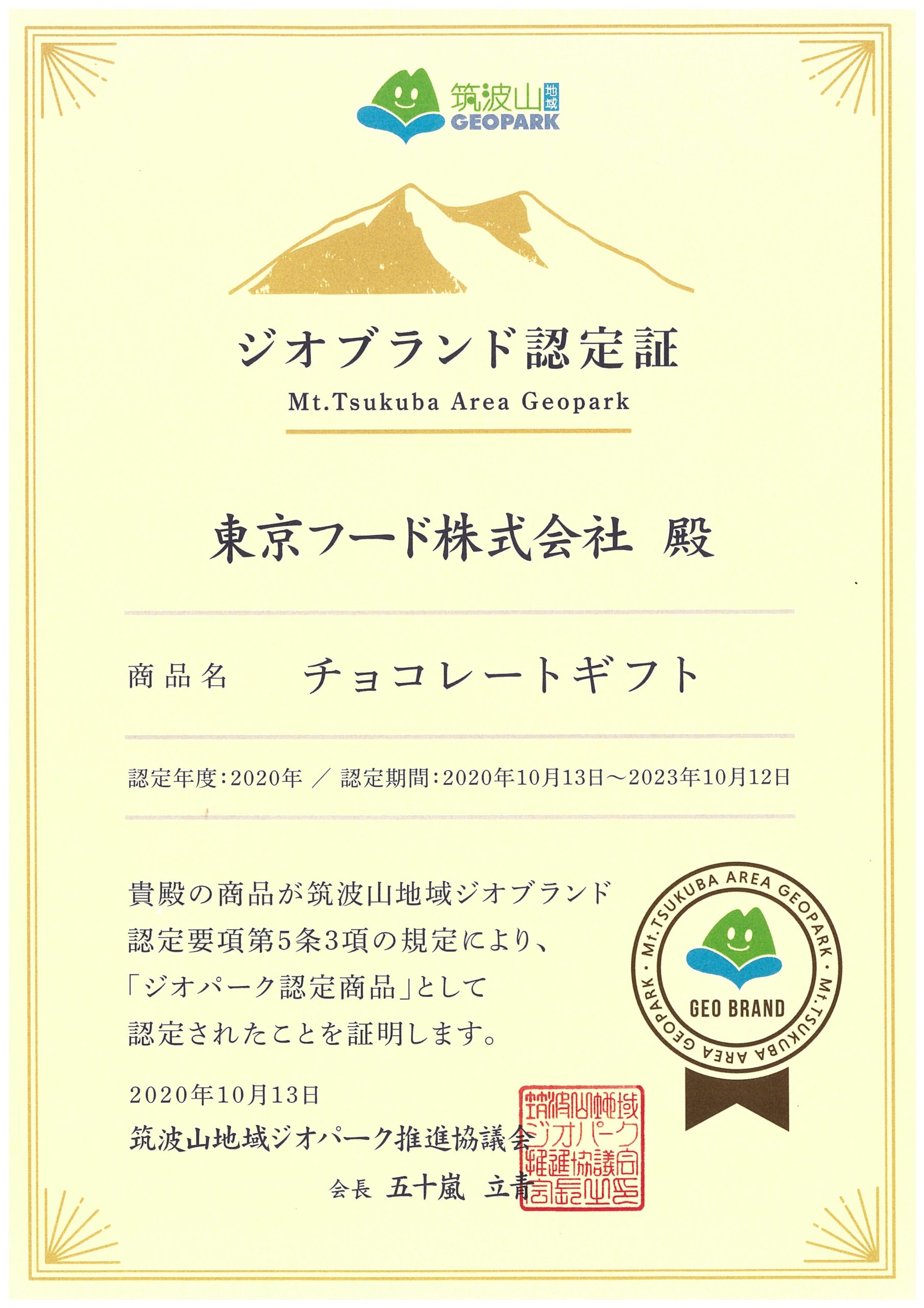 この度、東京フードの製品「チョコレートギフト」が筑波山地域ジオパーク認定商品に選ばれました。