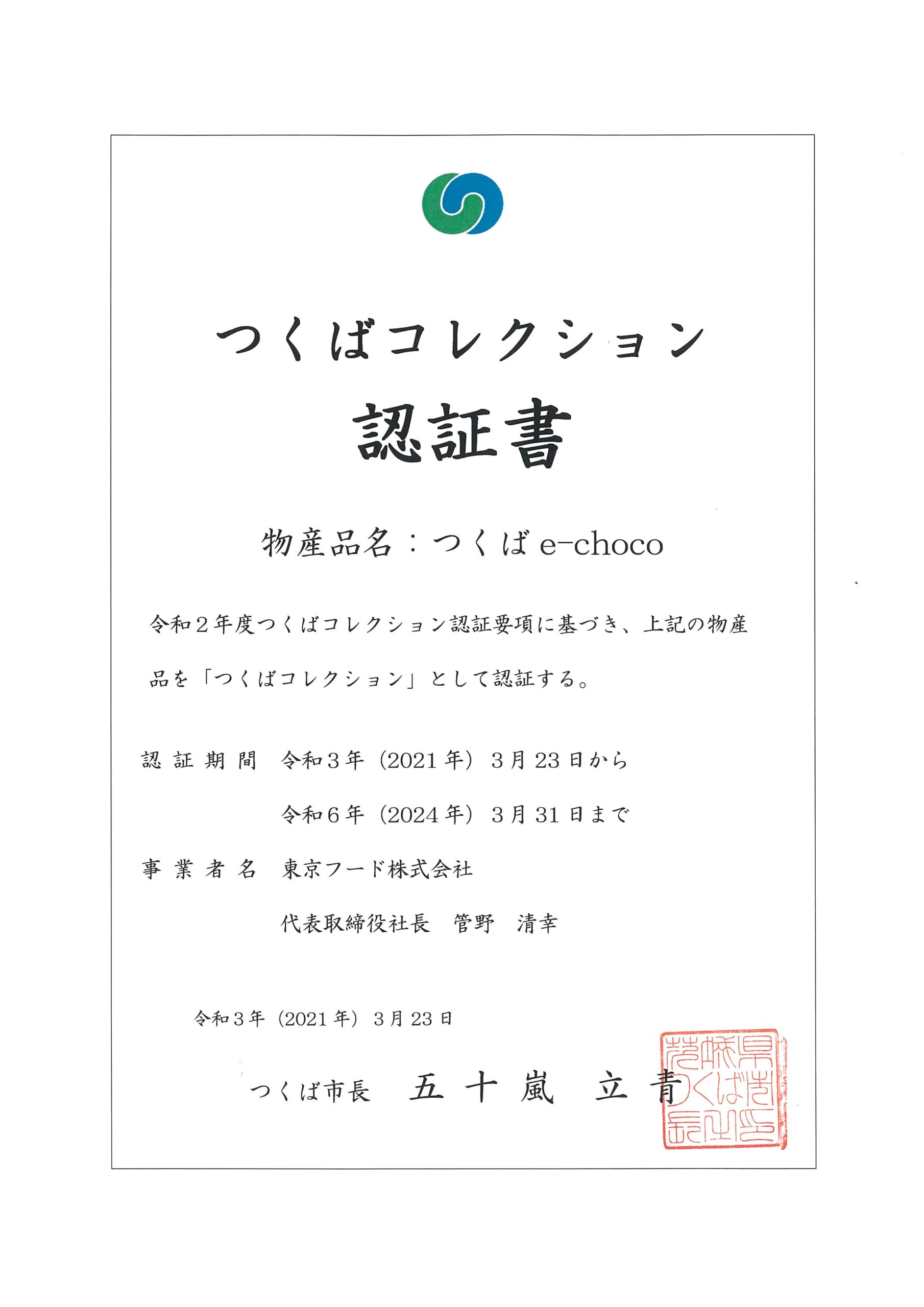 この度、東京フードの製品「つくばe-choco」がつくばコレクション認定商品に